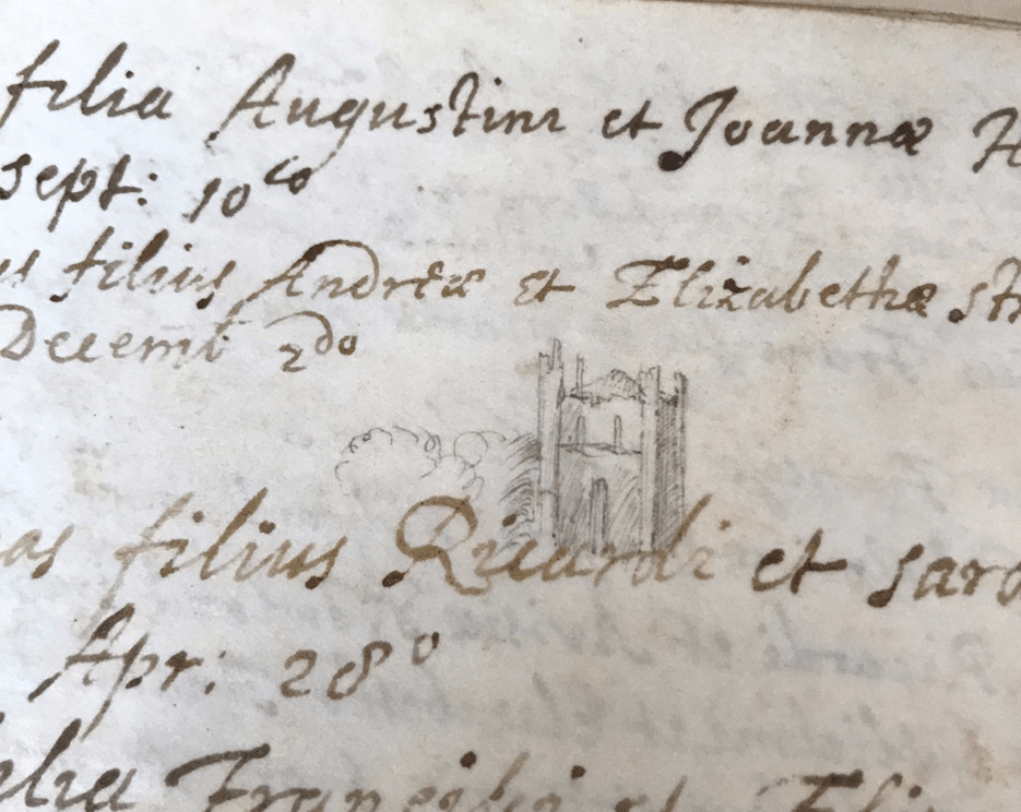 If you’re particularly lucky, you may find something strange and wonderful. Fig. 1 shows a page from Winkfield parish register D/P49/1/2. On this page from 1698, someone – perhaps the incumbent member of clergy who filled out the register – has carefully sketched the tower of a church. Interestingly, its profile does not match the parish church of Winkfield St Mary. Perhaps the building held some personal significance to the artist.