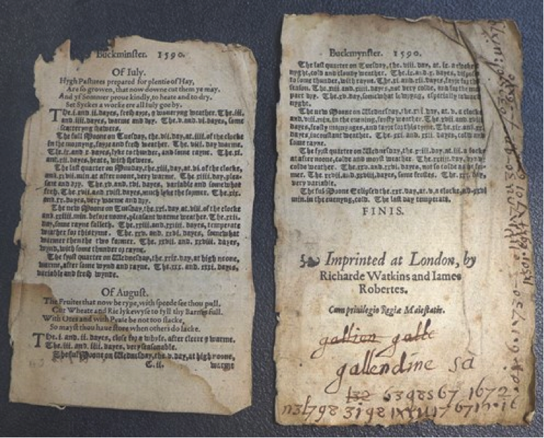 Leaves from a fragment of an almanac and prognostication by Thomas Buckminster (London,1590) RESERVE–528.2-BUC, University of Reading Special Collections.