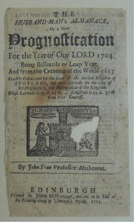 Fragment of ‘The husband-man’s almanac, or a new prognostication for … 1704′ by John True (Edinburgh, 1704) from the John Lewis Printing Collection, University of Reading Special Collections.