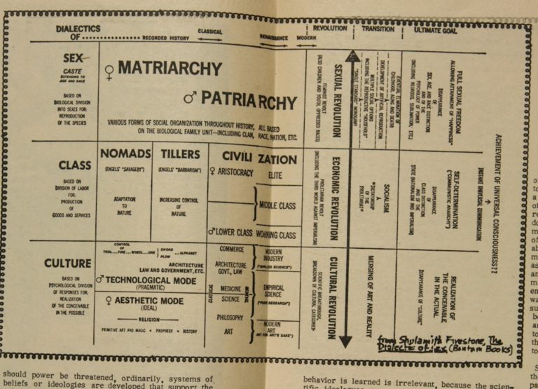 Here, feminism-meets-communism-meets-science-fiction; dialectics meet test-tube-babies. I’m a historian of feminism, and truly, I still have no idea what this chart is on about 15 years after I first came across it. I love it for its ambition, though: Shulie wrote in what I call feminism’s utopian moment, a short period between about 1968 and 1972 when anything seemed possible, and the world was up for grabs.