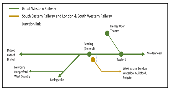 In order to take a share of the London traffic from the GWR, the Reading, Guildford, and Reigate Railway was proposed to join Reading to London Bridge via Reigate, supported by the South Eastern Railway (SER) who operated the line from its opening on the 4th July 1849, absorbing it in 1852. The London and South Western Railway (LSWR), supported and later absorbed the Staines, Wokingham & Wokingham Junction Railway which opened in 1856, with running powers over the Wokingham to Reading section of the SER.