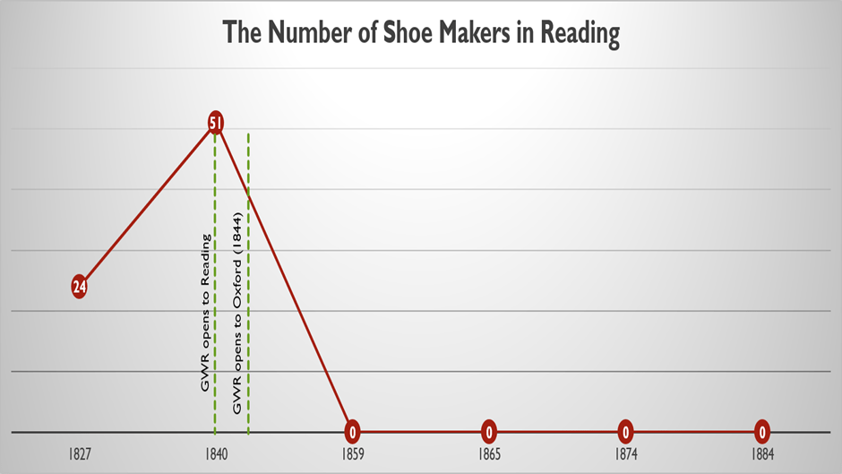 It would seem, from the local business directories, that something at odds with the histories had occurred. The Great Western Railway opened to Oxford in 1844 in turn to Birmingham and the Industrial Midlands, including Northampton and Leicester, which were specialising in the mass manufacture of footwear. The cheaper goods from these places would appear to have impacted negatively upon the small manufacturers in Reading, for whom, it seems, the arrival of the railways was nothing short of a disaster.