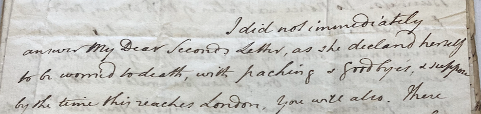 ‘I did not immediately answer my Dear […]’s letter, as she declared herself to be worried to death, with packing & goodbyes, & suppose by the time this reaches London, you will also.’