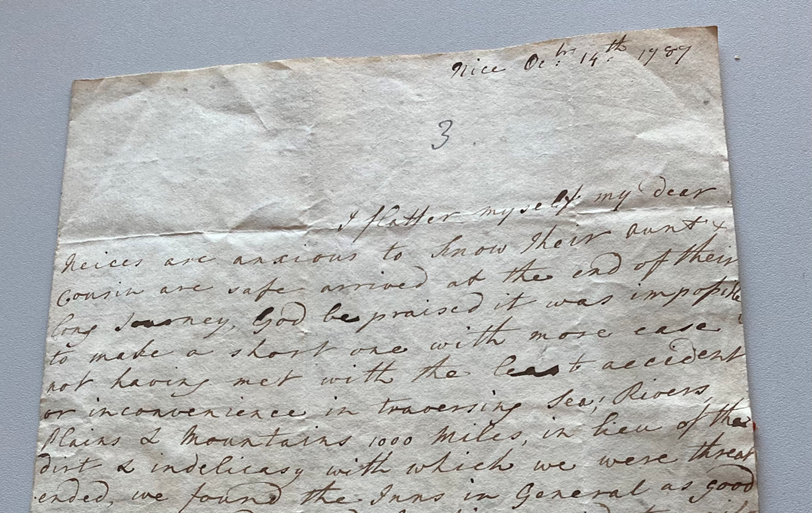 ‘I flatter myself my dear nieces are anxious to know how their aunt & cousin are safe arrived at the end of their long journey, God be praised it was impossible to make a short one with more care not having met with the least accident or inconvenience in traversing sea, rivers, plains & mountains 1000 miles, in lieu of the dirt & indelicacy with which we were threatened’
