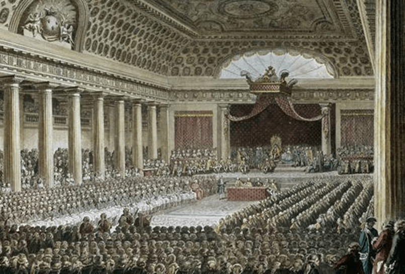 The decision to convene this medieval representative institution itself challenged the absolute authority of the king. The Bourbon rulers hadn’t called the Estates General since 1615. However, in August 1788, the looming bankruptcy left Louis XVI with no other choice. As the king feared, the decision generated new problems, and details pertaining the organizing of the Estates General transformed a political crisis into a social conflict. While the French were united in their dissatisfaction with ministerial policies and their desire to reform institutions, the Estates General proved inadequate. Traditionally, the elected deputies didn’t represent the population as a whole but rather each of the three estates: the clergy, the nobility, and the third estate (the rest of the population). As soon as the Estates General opened on May 6, the deadlock between Louis XVI’s government and the people shifted from a struggle for freedom to a conflict between the deputies of the nobility and the third estate, fighting now for equality. For six weeks, the Estates General were paralyzed as the nobility rejected repeated invitations from the third estate to sit and deliberate together in a common room. Ministerial attempts at reconciliation failed, leading the deputies of the Third Estate to proclaim themselves as the National Assembly, claiming to represent 94% of the nation.