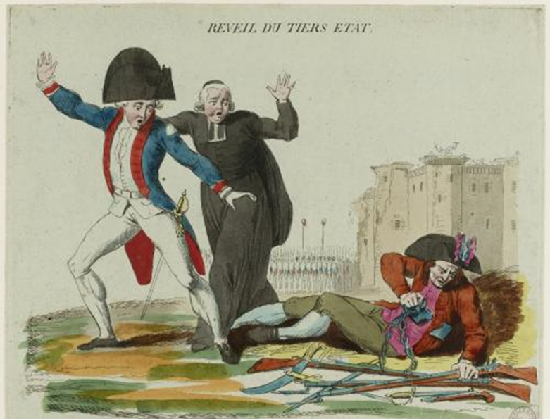 Image 1: Awakening of the Third Estate: two members of the nobility and the clergy are scared by the awakening of the third estate, or the people of Paris taking up arms. At the back the Bastille and a crowd carrying the head of the governor of the Bastille and his deputy.