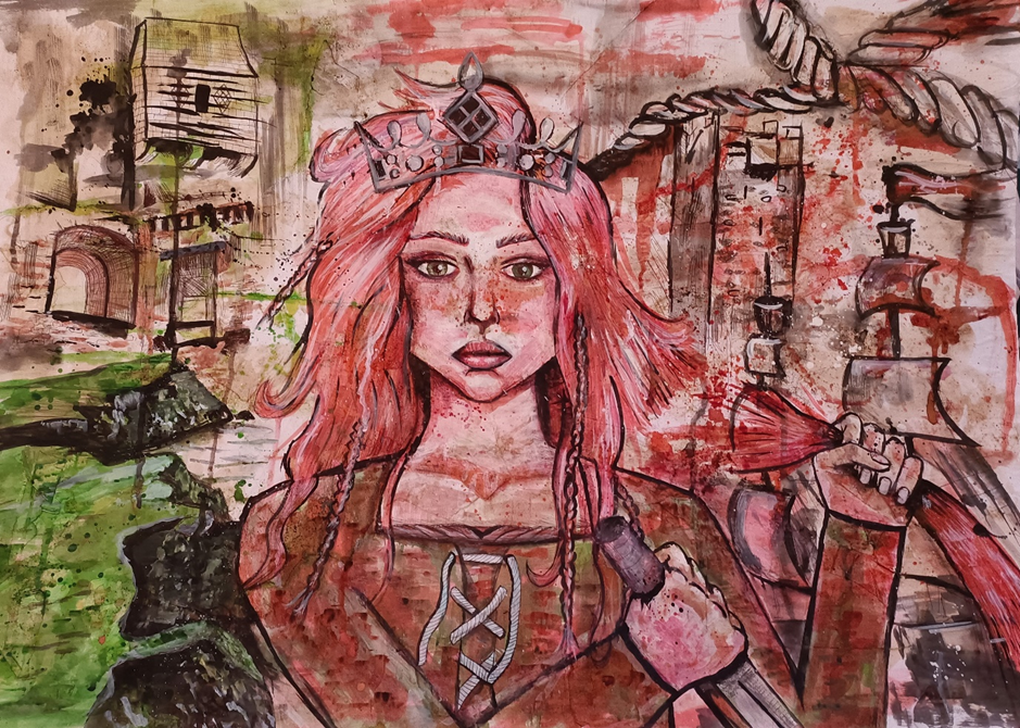 Neriece painted this gripping portrait of Grace O’Malley (the English version of her name; in Irish, it’s Gráinne Ní Mháille), focusing on the story that she defiantly cut her hair after her father refused to let her join him on a sea voyage. It is apparently with this act that the nickname ‘Gráinne Mhaol’, or ‘bald Grace’, began. Neriece based her styling of Grace on the statue outside Westport House in County Mayo, and researched the landscape of Clare Island and the architecture of Belclare Castle and Kildavnet Castle, featuring in the background. The striking colour palette represents the links to her home in Ireland and her dramatic involvement in piracy. For more on Grace O’Malley/Gráinne Ní Mháille, see these blog posts (here and here) from Royal Museums Greenwich.
