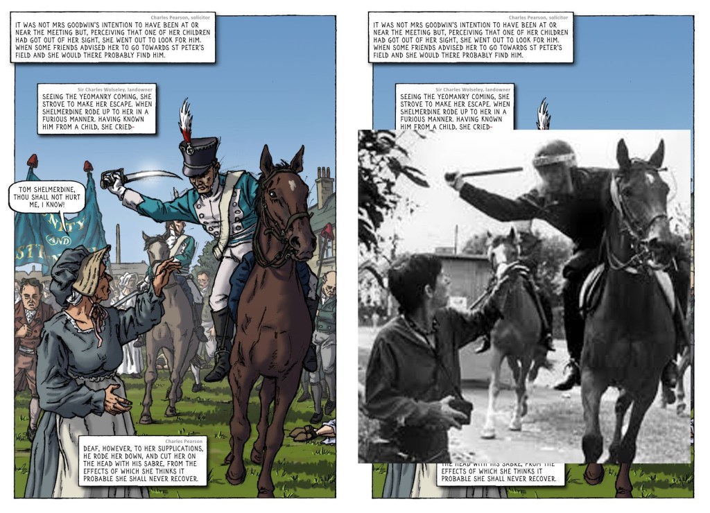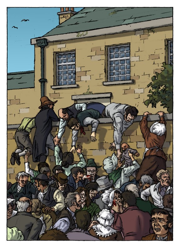 Polyp: A lot of comic book drawing has a tendency to melodrama and to glory in a pornography of violence. I try to avoid those extremes. The force-feeding scene in the suffragette chapter is obviously violent but it gets a lot of its power from the restraint on the other pages around it. And when I draw people in extreme situations, I try to avoid theatricality. I will often go back to real contemporary images and let them inspire my historical ones. One of my Peterloo images of a protestor being attacked is based on a famous photograph from Orgreave during the miner’s strike in 1984. Another one, depicting the Peterloo protesters trying to escape by climbing a wall, is based on a famous photograph of football fans escaping the Hillsborough disaster. I think both the physical realism and the resonance this creates with later struggles is important.