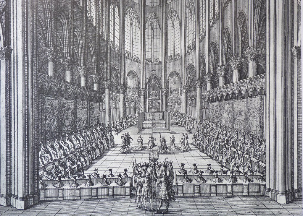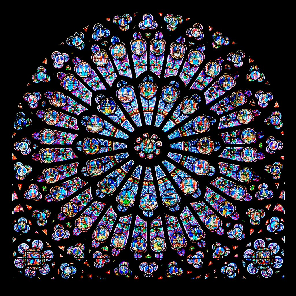 When the cathedral was built, between about 1160 and 1260, the stone would have been covered with a light lime-wash, probably coloured with pale yellow ochre, onto which masonry joints would have been painted in white. At least that is what was found at Chartres Cathedral, built around 1195-1250, and in the nave at the Abbey Church of Saint-Denis, dating around 1260 or 1270. At Chartres, the yellow paint has been reinstated in a controversial restoration – controversial because the modern paint just looks too heavy. No original paint was found on the stonework of Notre-Dame, apart from the chapels added to the choir in the fourteenth century – and that paintwork, newly cleaned and fresh, was largely nineteenth century. So we can’t be certain that Notre-Dame had its pale ochre wash – but it’s likely. If it did it would have been like being inside a vast gold reliquary, with stained glass windows glowing like jewels against it.