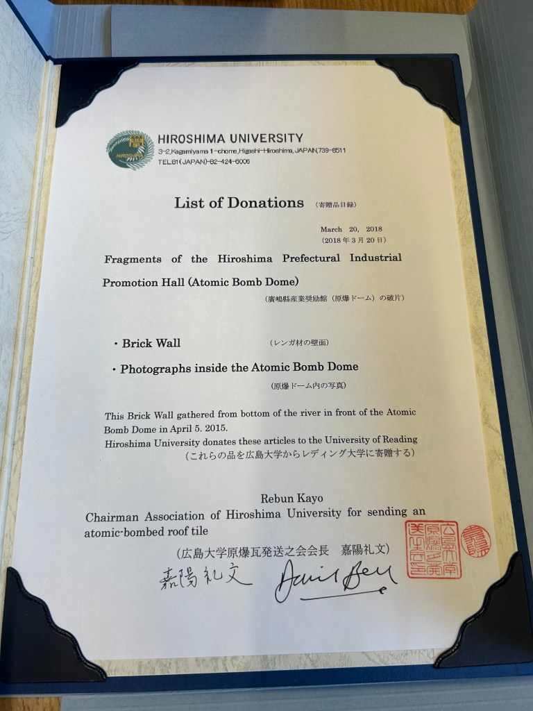 The tiles have travelled all the way from Hiroshima to the University of Reading and represent a gift from one university to another. There were two separate giftings of the tiles, the first in 2011 and the second in 2018. The first set of tiles were excavated from a riverbed near ground zero of the explosion. The second followed the 70th anniversary of the Hiroshima bombing attack where Dr Jacqui Turner and Dr Mara Oliva, of the Department of History at the University of Reading, organised a public event showcasing the first gifting of the tiles. This fulfilled the intentions of why the tiles had been sent: to spread the message of peace and advocate for the abolishment of nuclear weapons. The showcasing of the tiles deeply moved Reuben Kayo, the Chairman of the Association of Hiroshima University for Sending an Atomic-bombed Roof Tile. He subsequently organised a second shipment of tile fragments to be sent over. These were special, having previously made up the Hiroshima Genbaku Peace Dome, formerly the Hiroshima Prefectural Industrial Promotion Hall.
