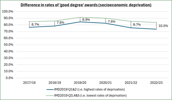 However, students from deprived neighbourhoods are disproportionately being left behind (see Figure 1.1 below). Reading students from deprived postcode areas are consistently less likely to stay on course, be awarded a strong result or land in employment, suggesting the playing field is not as level as we might think.