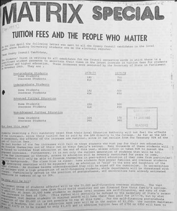 The University’s various periodicals and magazines gave insight into the lived experiences of working-class people as they entered higher education in greater numbers. Staff journals highlighted the experiences of the professional technicians who supported the running of the university. The presence (or lack thereof) of working-class people who remained in academia to work as teachers and subject experts in academic is less a matter of record. The student newspaper Matrix showed a strong reaction to tuition fee changes and the damaging impact they would have on working-class and international students.